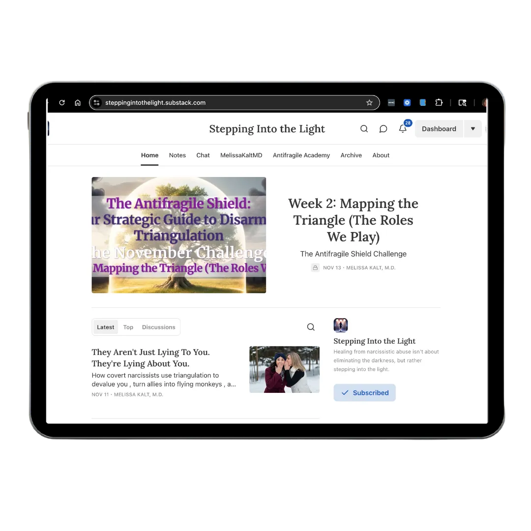 "The thing that impressed me the most about Dr. Melissa was her ability to see through the fog of my confusion and self-doubt. She patiently and clearly explained the dynamics of narcissistic abuse, validating my experiences and helping me understand that I was not the problem. Entering the Antifragile Program saved my sanity. This was HUGE for me. For so long, I had been blaming myself."